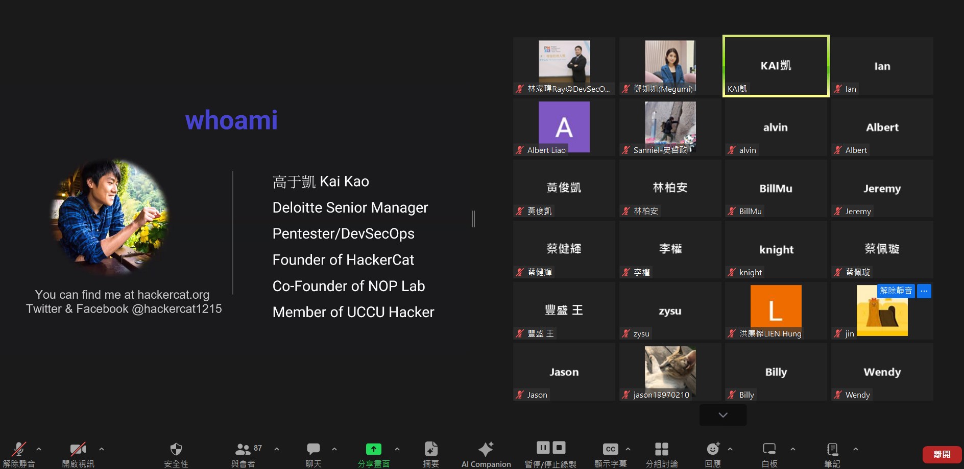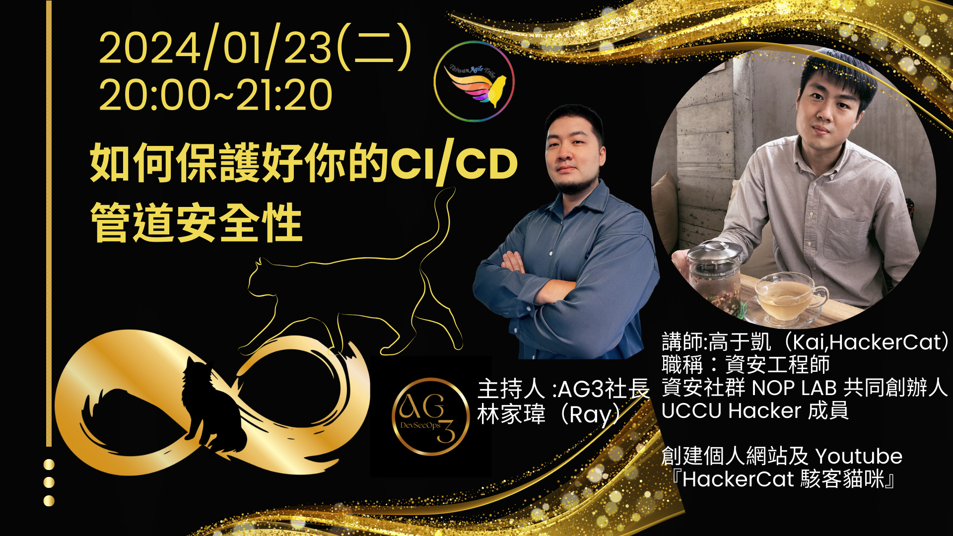 遇見資安界的頂尖高手 – 高于凱(Kai, HackerCat),資安社群 NOP LAB 共同創辦人、UCCU Hacker 成員。身為資安工程師,他專精於滲透測試、WebSecurity、DevSecOps、容器安全,將帶領我們深入探索保護CI/CD管道的關鍵策略。