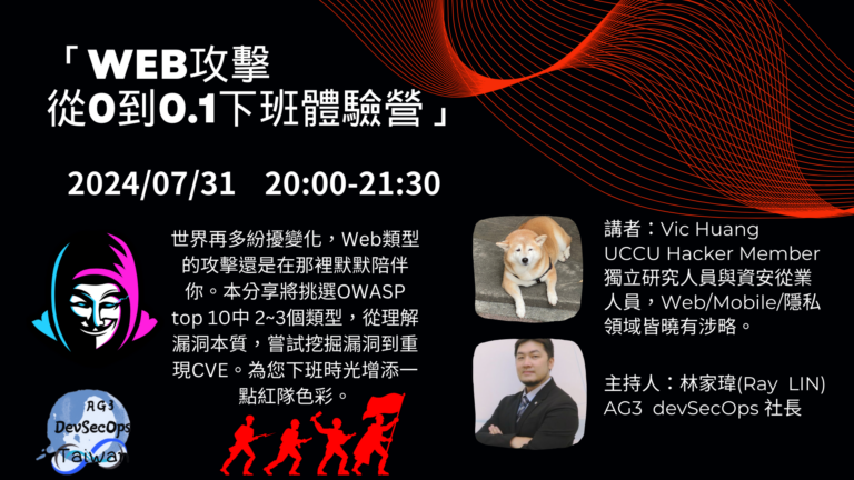 Web攻擊從0到0.1下班體驗營Vic Huang / 2024年07月31日